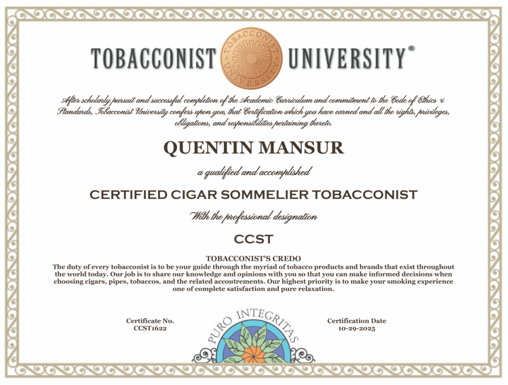 To elevate your experience even further, owner Quentin Mansur has earned the prestigious Certified Cigar Sommelier Tobacconist (CCST) designation from Tobacconist University. This internationally recognized diploma confirms his expertise in cigar selection, flavor profiles, humidor management, and pairing cigars with bourbon and other premium spirits.